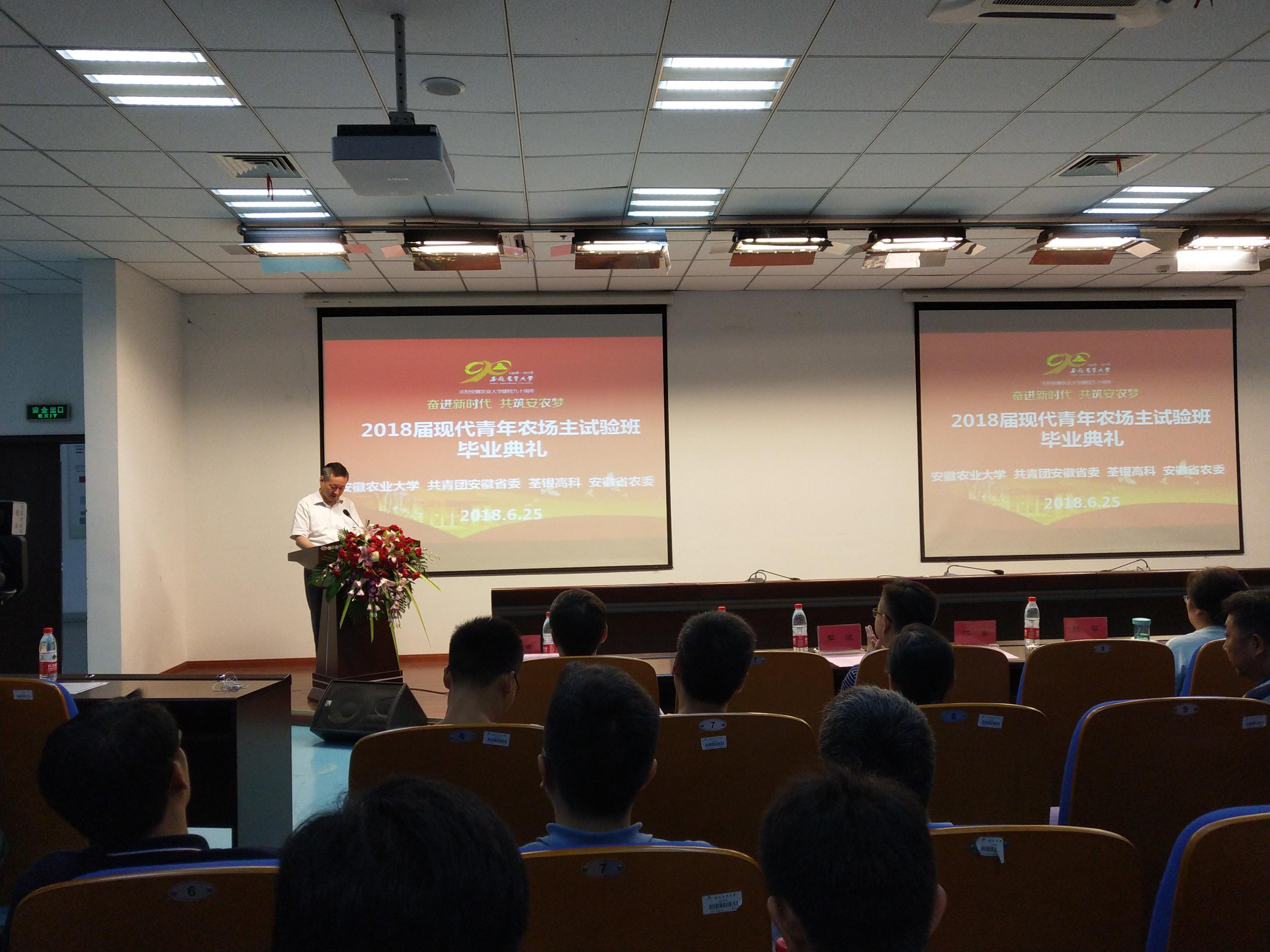 ??? 2018年6月25日上午,2018屆團校企“現代青年農場主”荃銀創新創業試驗班畢業典禮在安徽農業大學舉行。安徽農業大學黨委書記江春,共青團安徽省委員會副書記李波、荃銀高科董事長張琴出席畢業典禮。安徽農業大學副校長馬傳喜主持畢業典禮。巽風湖創業孵化基地總經理佘良東、荃銀高科定遠創業孵化基地負責人羅干以及安徽農業大學相關處室、學院等單位主要負責人、部分現代青年農場主試驗班的任課老師、2018屆現代青年農場主試驗班畢業生、2015級和部分2016級現代青年農場主試驗班學員參加了畢業典禮。