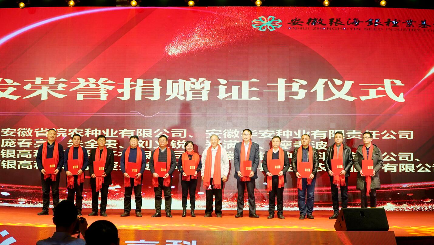 ?? “踐行公益,奉獻愛心”。會上,進行了安徽張海銀種業基金會頒發捐贈證書儀式,眾人拾柴火焰高,希望更多的人關注慈善公益事業,為公益多盡一份力。